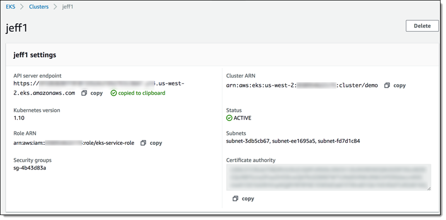 $ aws eks describe-cluster --region us-west-2 --name jeff1 --query cluster.endpoint