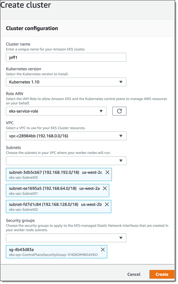 I enter a name for my cluster (which must match the one that I entered when I created the VPC, because Kubernetes relies on tagging of subnets), along with the subnet IDs and the security group ID, both for the VPC, and click Create:
