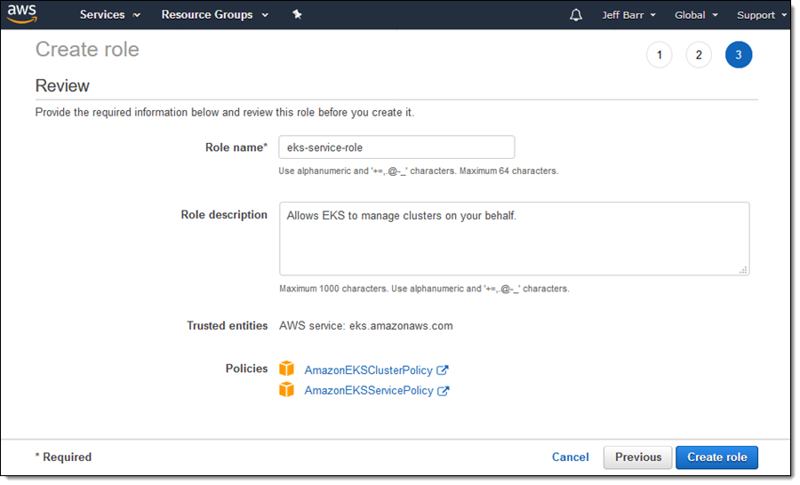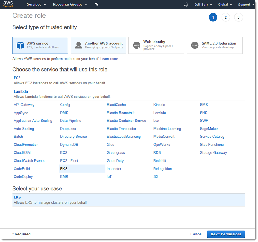 Following the directions in the Amazon EKS Getting Started Guide, I begin by creating an IAM role. Kubernetes assumes this role and uses it to create AWS resources such as Elastic Load Balancers. Once created, this role can be used for all of my clusters.I open up the IAM console, click Create role, select EKS, and click Next:Permissions: