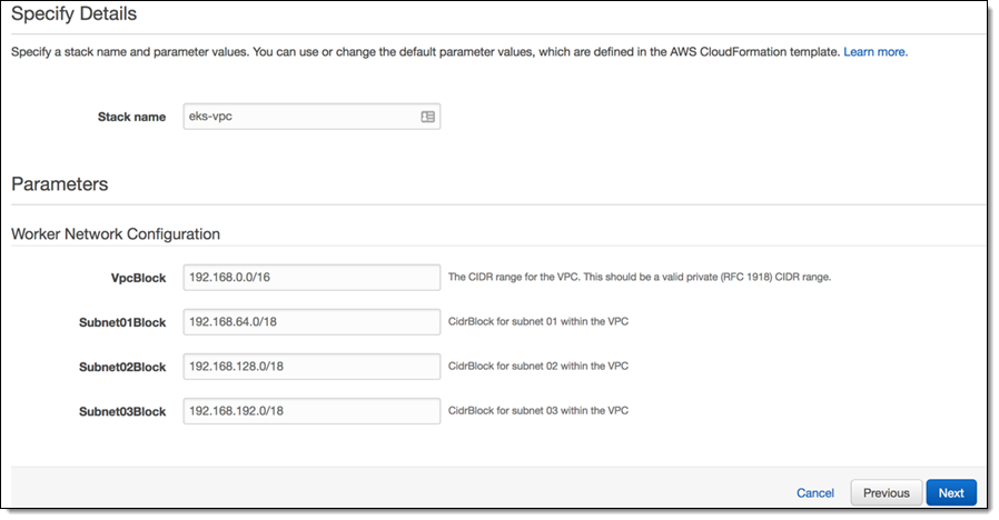 Next, I create a VPC (Virtual Private Cloud) using the sample template from the Getting Started Guide, with the following parameters: