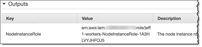 The stack is created in a couple of minutes and sets up IAM roles, security groups, and auto scaling. I’ll need the ARN of the NodeInstanceRole: