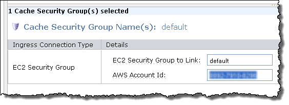 The first step is to create a Cache Security Group. Each such group allows access to the cluster from the EC2 instances associated with one or more EC2 Security Groups. The EC2 security groups are identified by name and AWS Account Id: