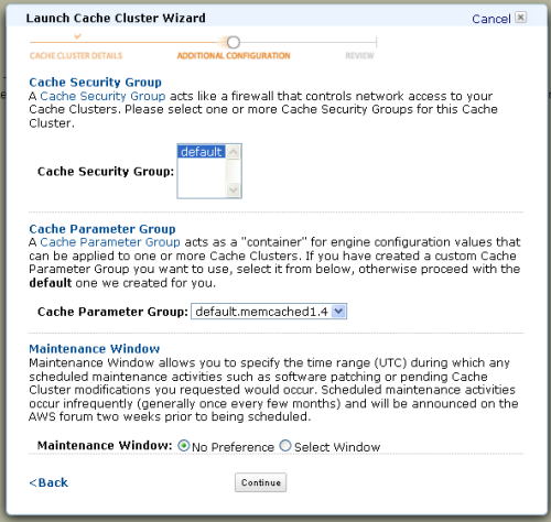 Next, you can select one or more Cache Security Groups, and a Cache Parameter Group. You can also specify a maintenance window during which Amazon ElastiCache will install patches and perform other pending modifications to the cluster.
