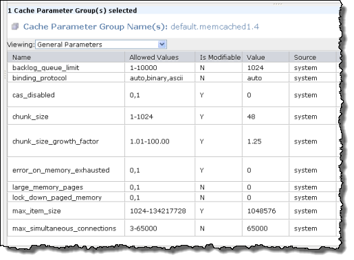 You can also inspect each of your Cache Parameter Groups. The groups can be modified using the Amazon ElastiCache APIs or from the command line.