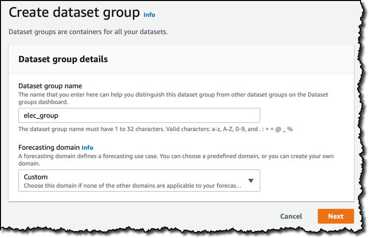 In the Amazon Forecast console, the first step is to create a dataset group. Dataset groups act as containers for datasets that are related.