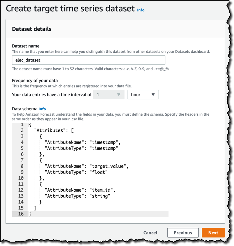 Next, I create a dataset. The data I am going to upload is aggregated by the hour, so 1 hour is the frequency of my data. The default data schema depends on the forecasting domain I selected earlier. I am using a custom domain here, and I change the data schema to have a timestamp, a target_value, and an item_id, in that order, as you can see in the sample few lines of data at the beginning of this post.