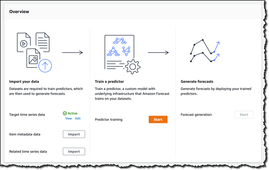 Let’s see how easy it is to build a predictor and get forecasts by using the Amazon Forecast console. Another option, for more advanced users, would be to use a Jupyter notebook and the AWS SDK for Python. You can find some sample notebooks in this GitHub repository.