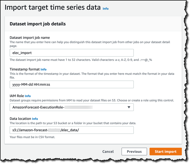 Now is the time to upload my time series data from Amazon Simple Storage Service (Amazon S3) into my dataset. The default timestamp format is exactly what I have in my data, so I don’t need to change it. I need an AWS Identity and Access Management (IAM) role to give Amazon Forecast access to the S3 bucket. I can select one here, or create a new one for this use case. As usual, avoid creating IAM roles that are too permissive and apply a least privilege approach to reduce the amount of permissions to the minimum required for this activity. After I tell Amazon Forecast in which S3 bucket and folder to look for my historical data, I start the import job.