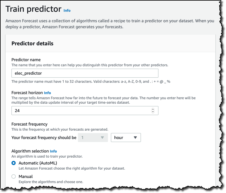 To train the predictor, I can select a specific machine learning algorithms of my choice, such as ARIMA or DeepAR+, but I prefer simplicity and use AutoML to let Amazon Forecast evaluate all algorithms and choose the one that performs best for my dataset.
