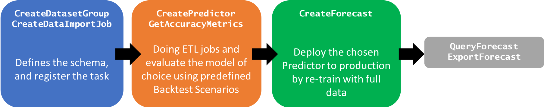 Here’s the overall flow of the Amazon Forecast API, from creating the dataset group to querying and extracting the forecast: