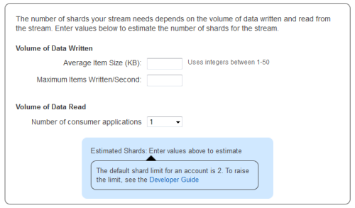 Use this data to calculate how many Shards of capacity youll need to ingest the incoming data. The Kinesis console helps you estimate using a wizard, but lets do the math here. 10,000 (PUTs per second) * 2 kilobytes (per PUT) = 20 megabytes per second. You will need 20 Shards to process this stream of data.