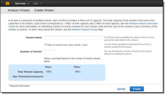 Click on the Create Stream button to get started. You need only enter a stream name and the number of shards to get started: