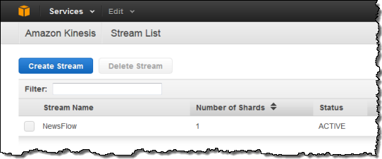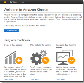 You can create and manage Kinesis streams using the Kinesis APIs, the AWS CLI, and the AWS Management Console. Here’s a brief tour of the console support.