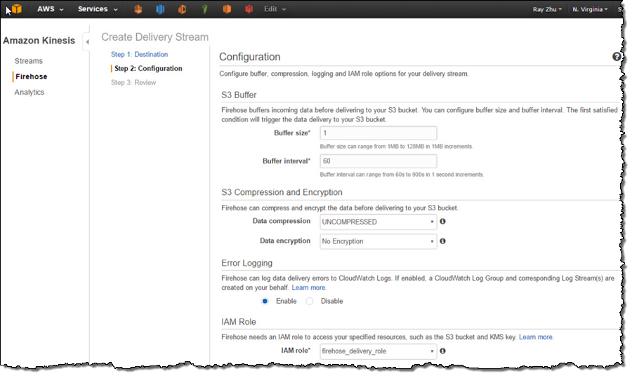 I also enable error logging for Kinesis Firehose to log any delivery errors to my CloudWatch Log group. The error messages are viewable from Kinesis Firehose console as well and are particularly useful for troubleshooting purpose.