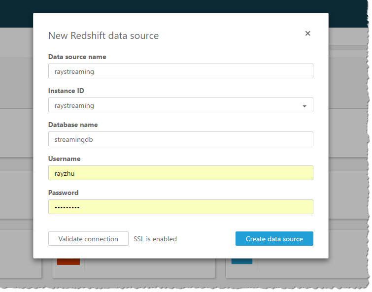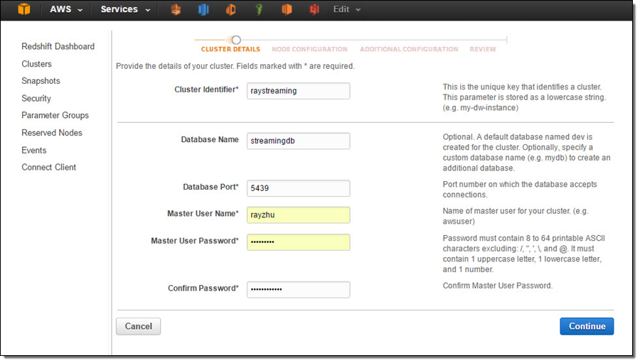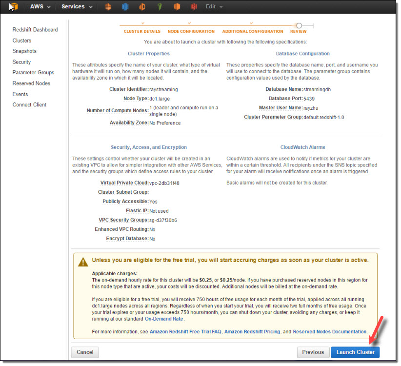 In this step, I’ll set up a Redshift table for Kinesis Firehose to continuously load streaming data into. I first start a single node Redshift cluster and name it “raystreaming.”