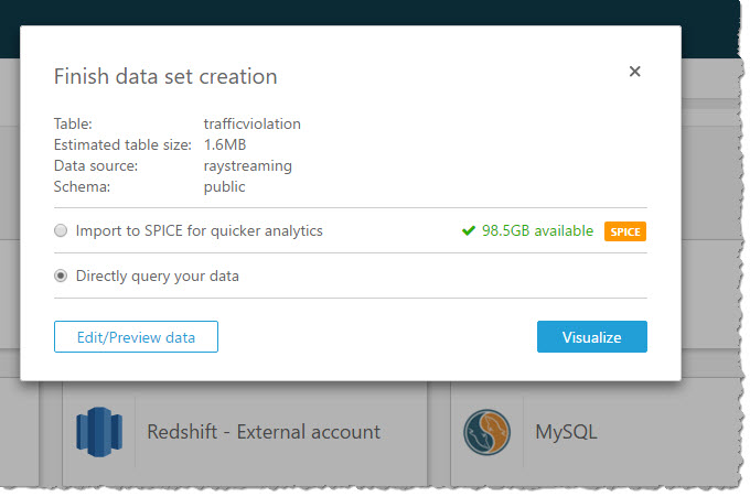 Now I’m going to use QuickSight to analyze and visualize the data from my Redshift table “TrafficViolation”. I create a new analysis and a new data set pointing to my Redshift table “TrafficViolation”.