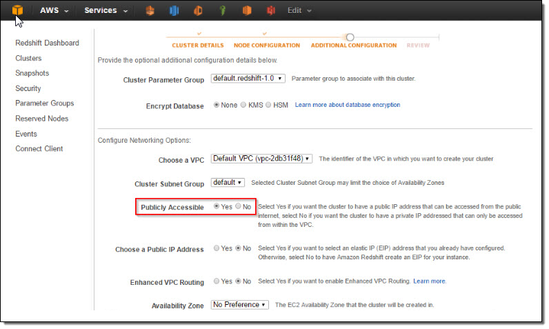 Under “Additional Configuration”, I make the cluster publicly accessible so that Kinesis Firehose and QuickSight can connect to my cluster.