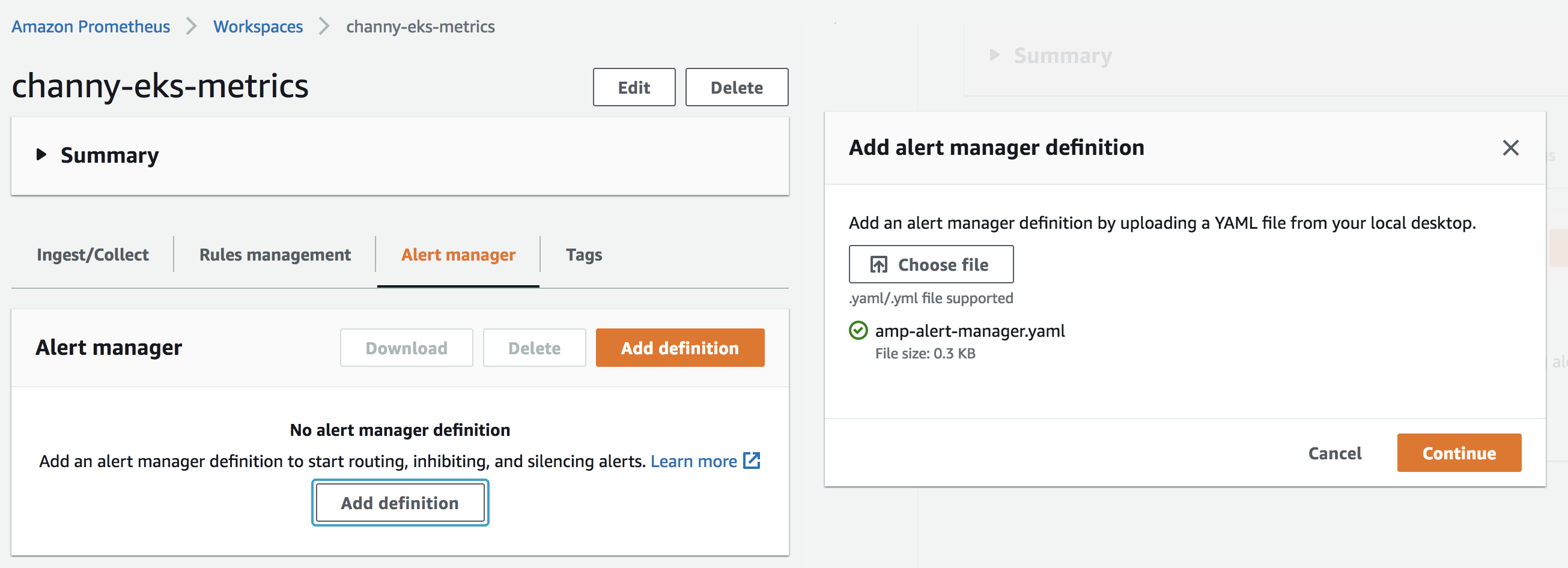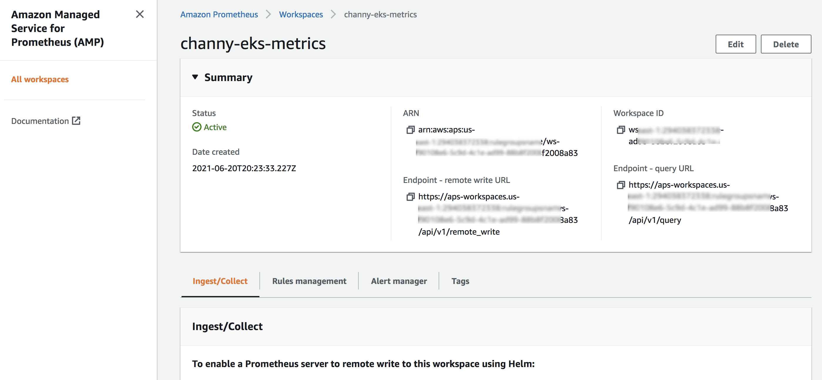 To get started in the AWS Management Console, you can simply create a workspace, a logical space dedicated to the storage, alerting, and querying of metrics from one or more Prometheus servers. You can set up the ingestion of Prometheus metrics to this workspace using Helm and query those metrics. To learn more, see Getting started in the Amazon Managed Service for Prometheus User Guide.