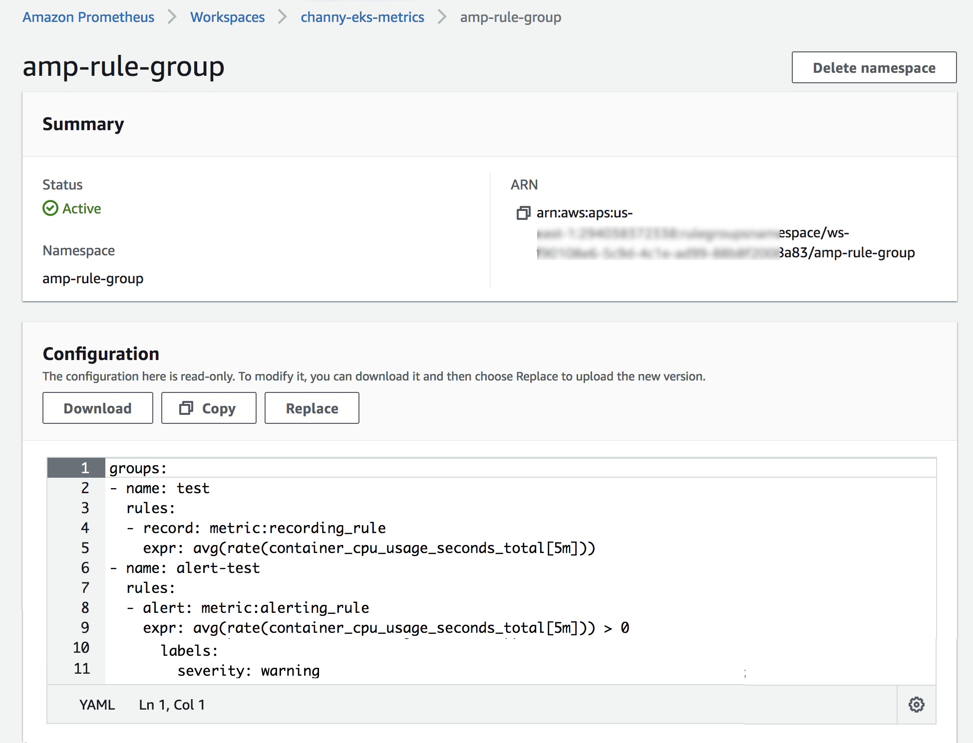 At general availability, we added new alert manager and rules management features. The service supports two types of rules: recording rules and alerting rules. These rules files are the same YAML format as standalone Prometheus, which may be configured and then evaluated at regular intervals.