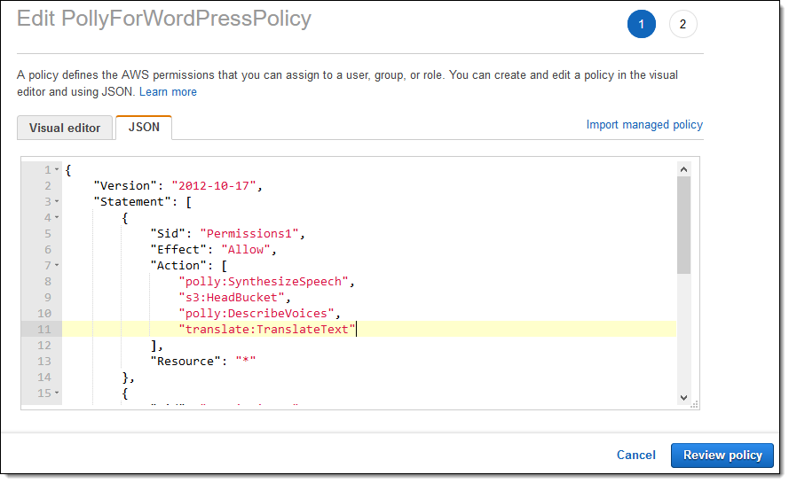 My earlier post covered the steps involved in launching an Amazon Lightsail instance and setting up the plugin, and I won’t repeat them here. The first step is to edit my existing IAM policy so that it allows calls to the TranslateText function: