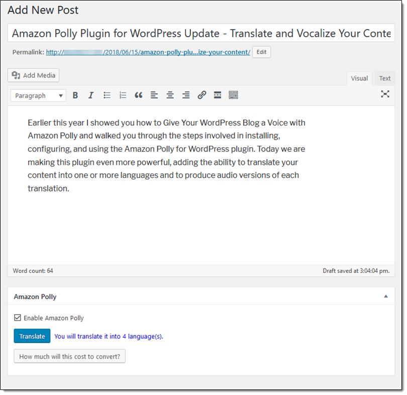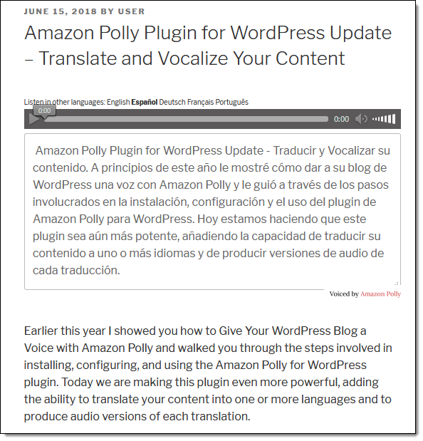 Earlier this year I showed you how to Give Your WordPress Blog a Voice with Amazon Polly and walked you through the steps involved in installing, configuring, and using the Amazon Polly for WordPress plugin. Today we are making this plugin even more powerful, adding the ability to translate your content into one or more languages and to produce audio versions of each translation. The translation is implemented using Amazon Translate, a neural machine translation service that is part of our portfolio of machine learning services.