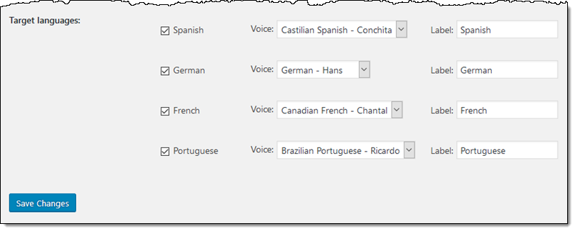 I click Enable translation support and Save Changes, then come back and set up the details. I select all of the available target languages, leave the voices and labels as-is, and click Save Changes to move forward: