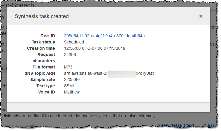 This feature makes it easier for you to use Polly to generate speech for long-form content such as articles or book chapters by allowing you to process up to 100,000 characters of text at a time using asynchronous requests. The synthesized speech is delivered to the S3 bucket of your choice, with failure notifications optionally routed to the Amazon Simple Notification Service (Amazon SNS) topic of your choice. The generated audio can be up to 6 hours long, and is typically ready within minutes. In addition to 100,000 characters of text, each request can include an additional 100,000 characters of Speech Synthesis Markup Language (SSML) markup.