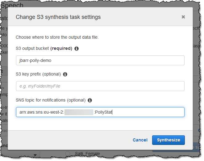 I enter the name of my S3 bucket (which must be in region where I plan to create the task), and click Synthesize to proceed: