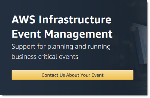 AWS Infrastructure Event Management (IEM) helps our customers to plan and run large-scale business-critical events.This program is included in the Enterprise Support plan and is available to Business Support customers for an additional fee. IEM includes an assessment of operational readiness, identification and mitigation of risks, and the confidence to run an event with AWS experts standing by and ready to help.