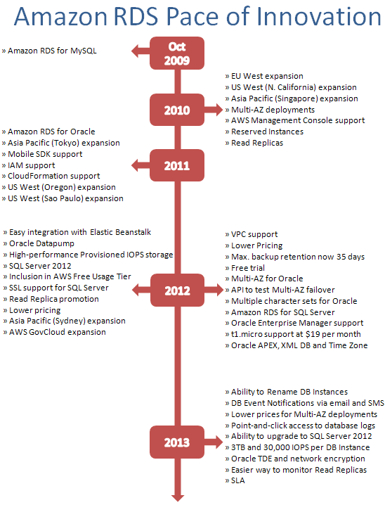 We have added support for three major database engines (MySQL, Oracle, and SQL Server), expanded support to all nine of the AWS Regions, and added more than 50 highly requested features. Here is a timeline to give you a better idea of how many additions we have made to RDS since we launched it: