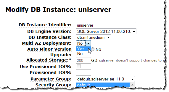 Setting up traditional SQL Server Mirroring requires hundreds of manual steps at the database and operating system level. With RDS, you can launch a fully managed, highly available instance of SQL Server with a few clicks in the AWS Management Console. If you choose the Standard or Enterprise edition of SQL Server 2008R2 or 2012, the console will ask you if the instance is for production use. In other words, it wants to know if you need a Multi-AZ deployment and Provisioned IOPS: