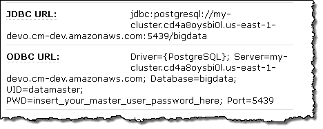 Once the cluster is up and running, the JDBC and ODBC connection strings are available in the console: