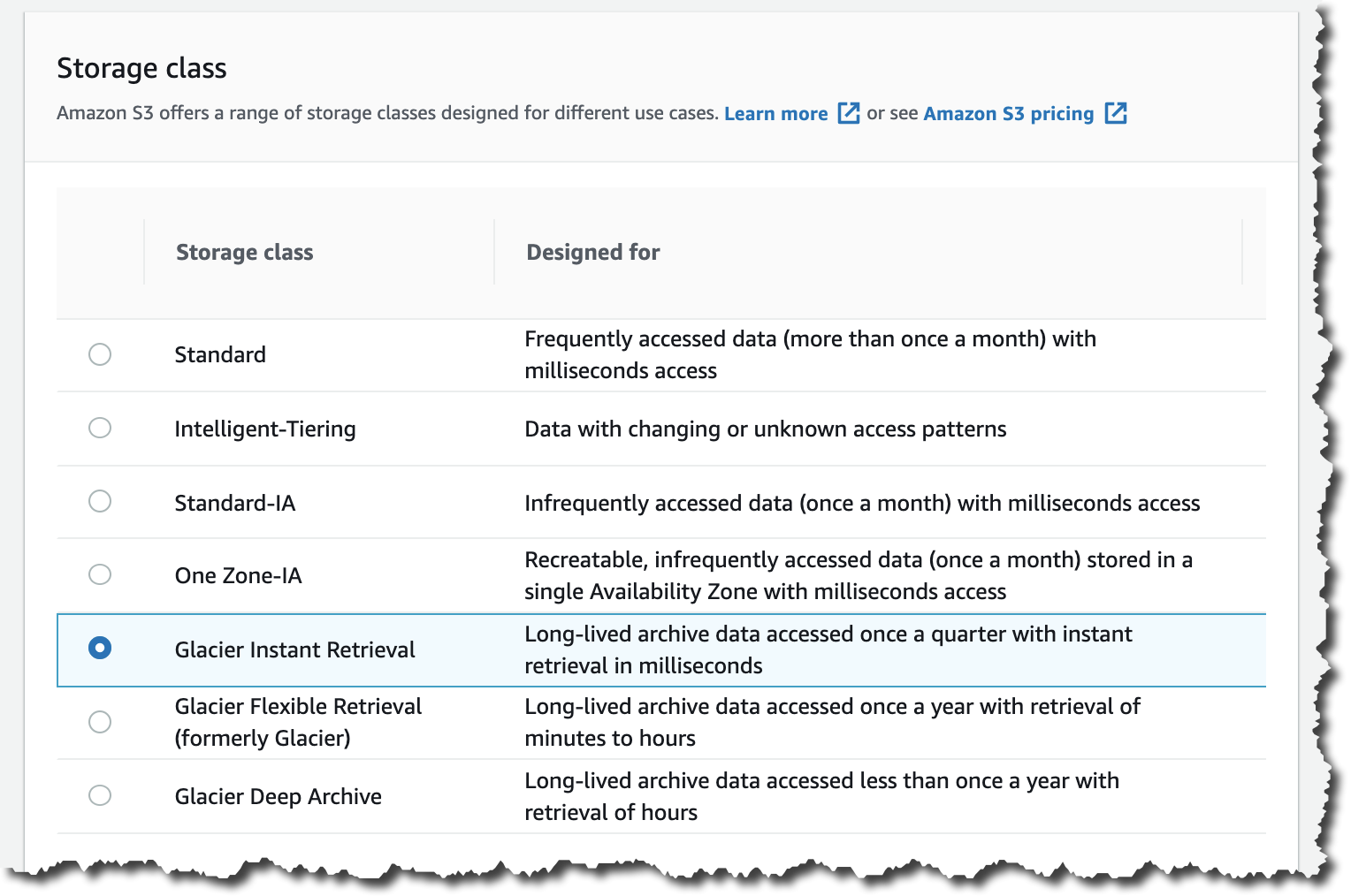 These are the Amazon S3 archive storage classes: