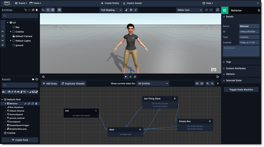 Sumerian gives you a web-based editor that you can use to quickly and easily create realistic, professional-quality scenes. There’s a visual scripting tool that lets you build logic to control how objects and characters (Sumerian Hosts) respond to user actions. Sumerian also lets you create rich, natural interactions powered by AWS services such as Amazon Lex, Polly, AWS Lambda, AWS IoT Core, and Amazon DynamoDB.