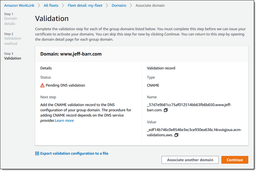 Amazon WorkLink will validate the DNS entry (this can take four or five hours; email is a bit quicker). I can repeat this step for all desired domains, and I can add even more later.