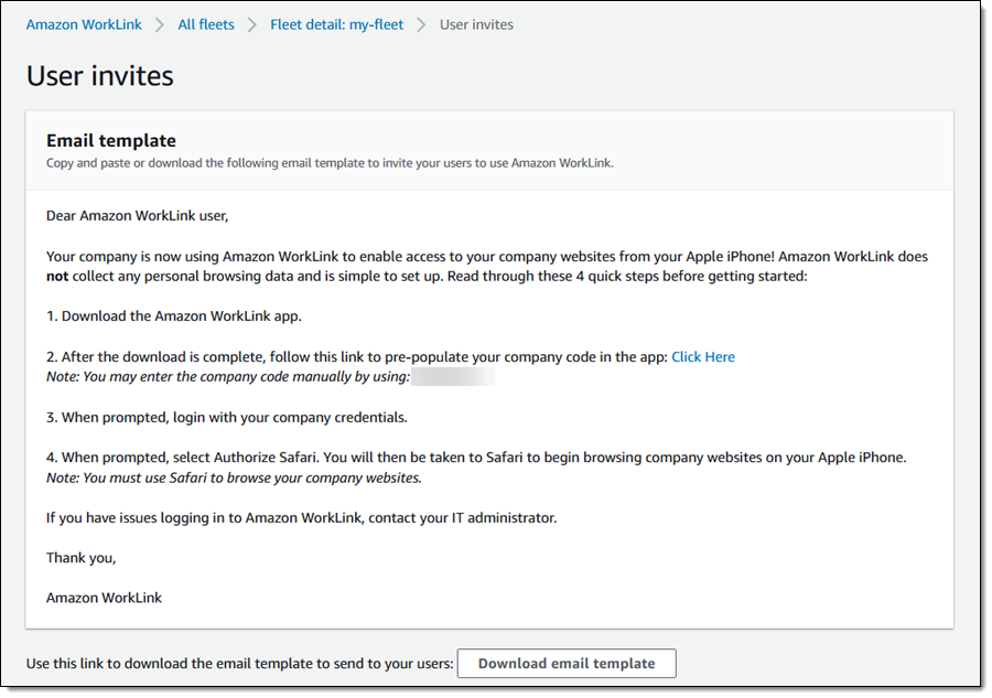 With the fleet created, you can use the email template provided by WorkLink to extend invitations to users. The users accept the invitations, install the WorkLink app, and sign in using their existing corporate identity.