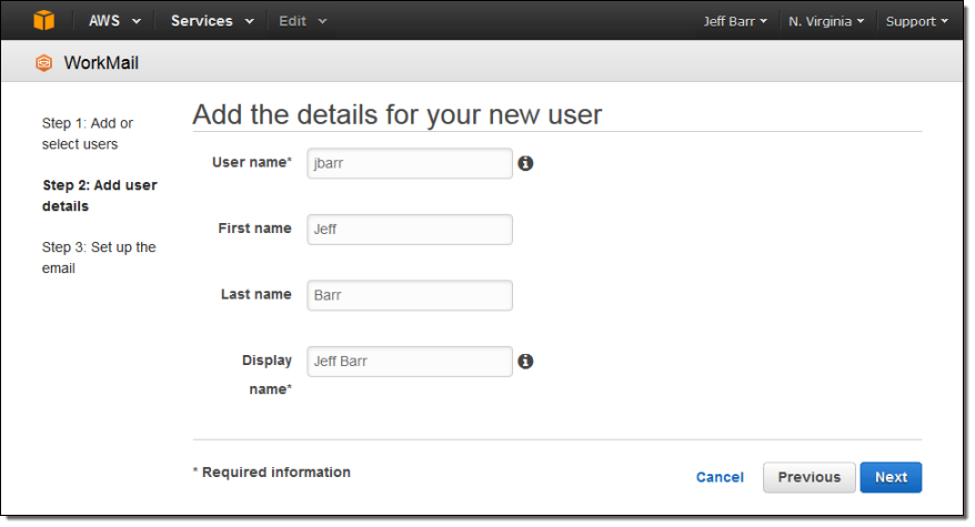 After the creation process completes I can begin to add Amazon WorkMail users to my organization (if I had used an existing directory in the previous step I could simply select them from a list at this point). I’ll begin by adding myself: