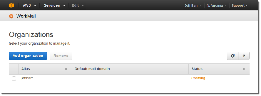 Let’s walk through Amazon WorkMail while wearing our email administrator hats! I need to create a Amazon WorkMail organization. In most cases, I would use a single organization for an entire company.