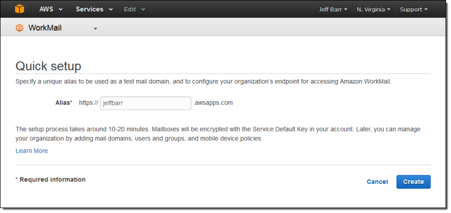 You can set up Amazon WorkMail for a new organization in a matter of minutes. As I mentioned earlier, you can use your existing directory or you can have Amazon WorkMail set one up for you. You can send and receive email through your existing domain name by adding a TXT record (for verification of ownership) and an MX record (to route the mail to Amazon WorkMail to your existing DNS configuration).