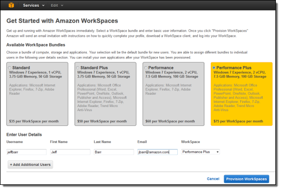 The next step is to provision one or more WorkSpace users. As part of this process you will select a hardware and software bundle for each new user. There are currently four WorkSpace bundles, with 1 or 2 virtual CPUs (vCPUs), 3.75 or 7.5 GiB of RAM, and 50 or 100 GB of storage. Prices range from $35 to $75 per WorkSpace per month.