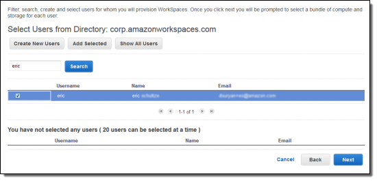 If you are making use of an existing directory, provisioning is a matter of searching for users and then adding them to the list of WorkSpaces Users: