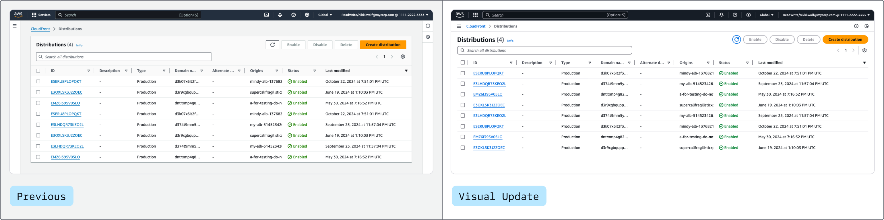We modernized the interface while retaining familiarity to continue to offer predictable and recognizable experiences across AWS. The user experience is now easier on the eyes, thanks to the use of rounder shapes, brighter colors, and improved layout treatment. These updates create a smoother, more natural appearance, making the interface more visually pleasing.