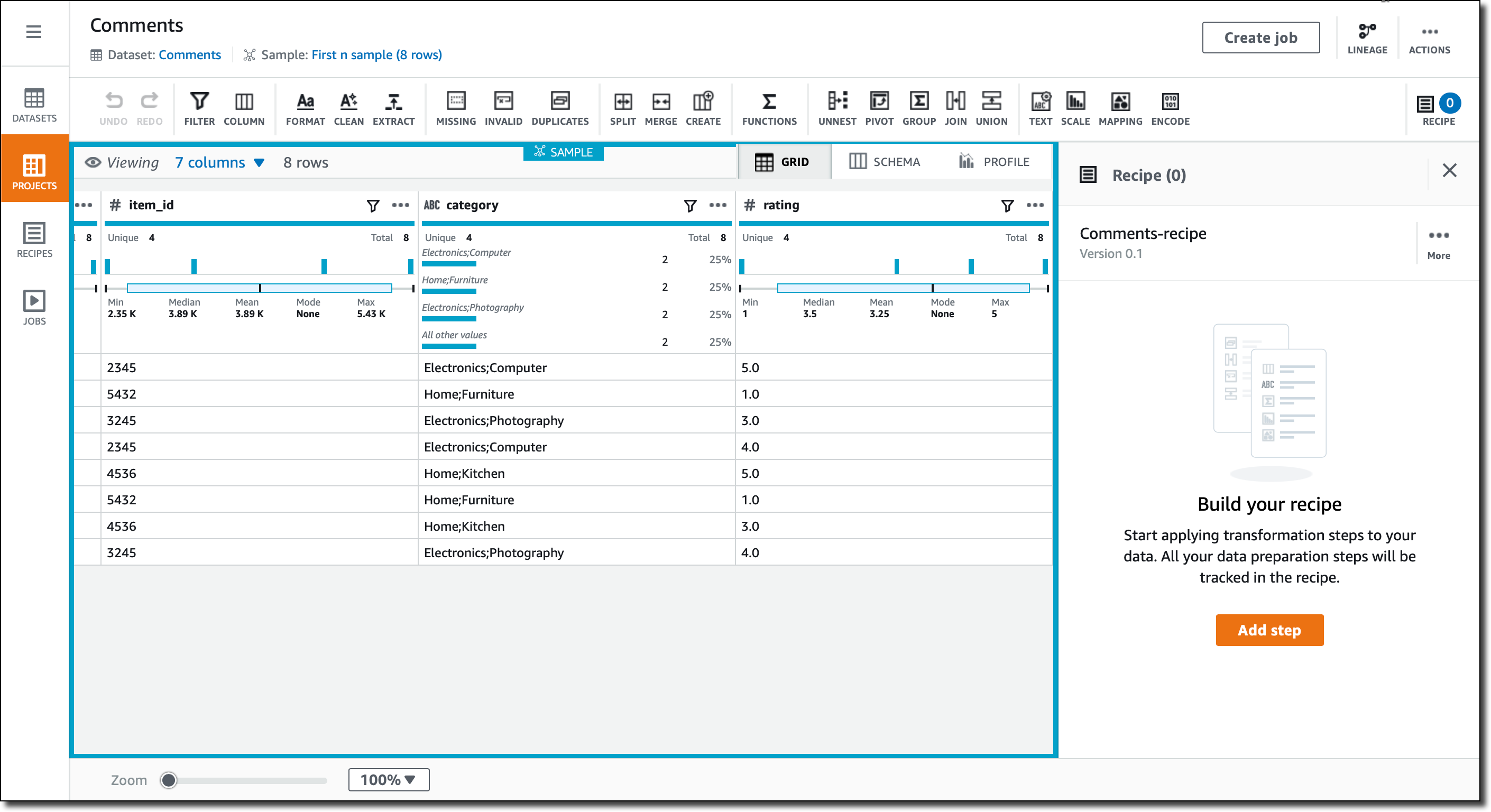- You can then save, publish, and version recipes, and automate the data preparation tasks by applying recipes on all incoming data. To apply recipes to or generate profiles for large datasets, you can run jobs.
