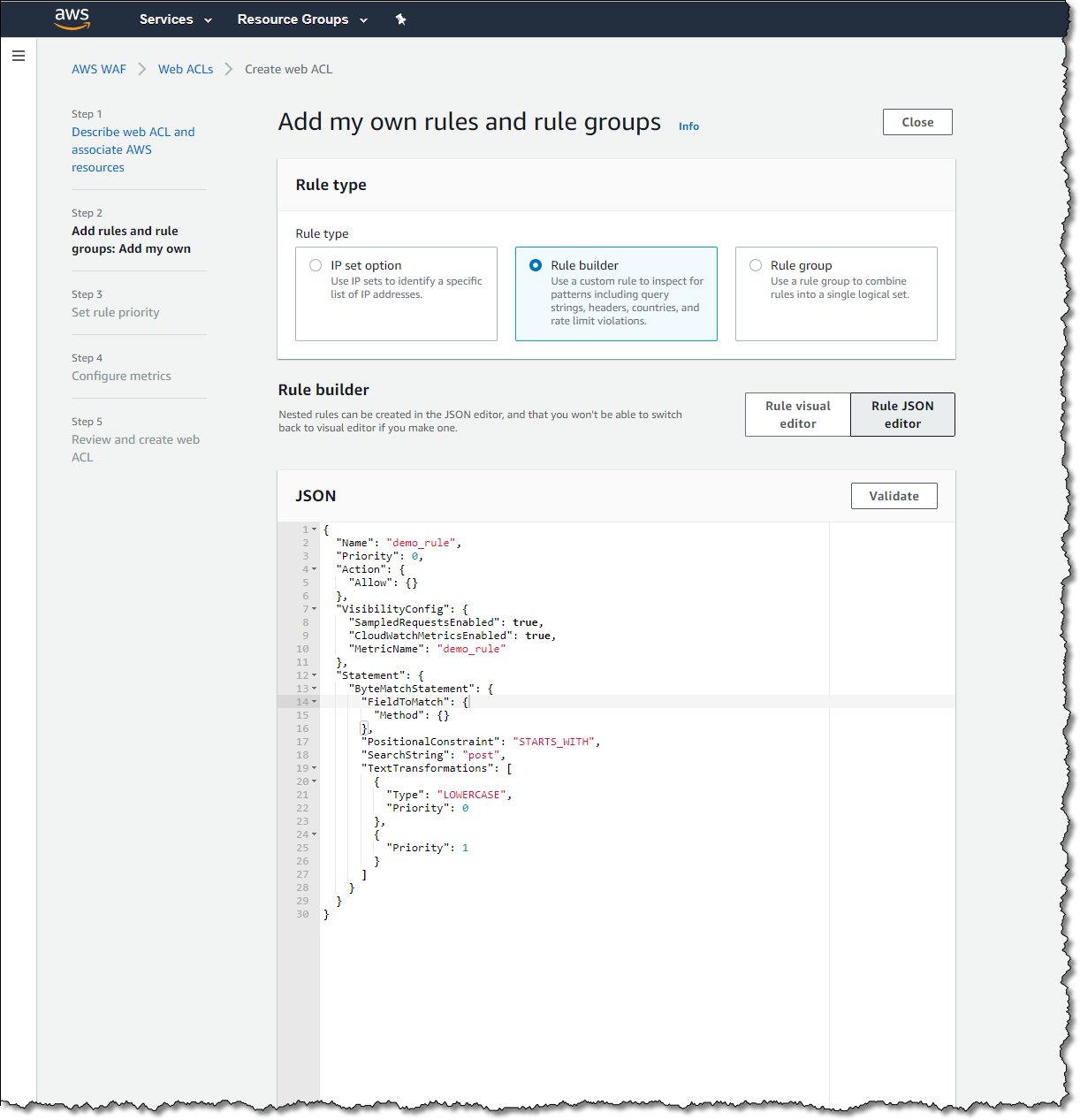 Now I can start adding some rules to our web ACL. With the new AWS WAF, the rules engine has been improved. Statements can be combined with AND, OR, and NOT operators, allowing for more complex rule logic.