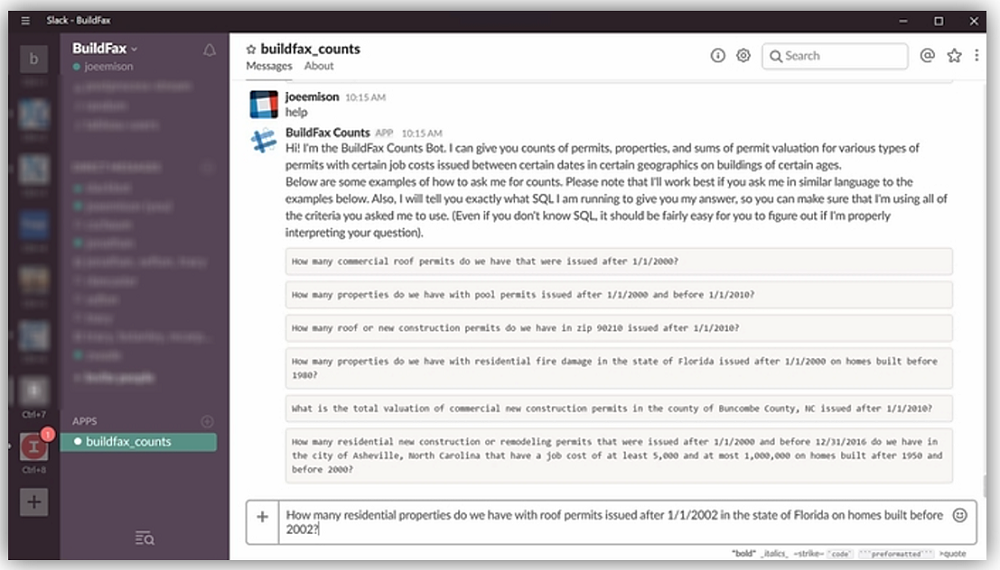 The BuildFax Counts chatbot solves this problem by taking the permit inquiry that would normally be sent into a ticket from the sales and marketing team, as input from Slack to the chatbot. Once the inquiry is submitted into Slack, a query executes and the inquiry results are returned immediately.