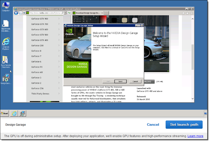 Let’s take an existing Windows application and make it available via streaming! Since AppStream runs the application on EC2’s GPU-equipped g2 instance type, I went to the NVIDIA Demos page and chose the Design Garage. Then I opened up the Console and selected AppStream: