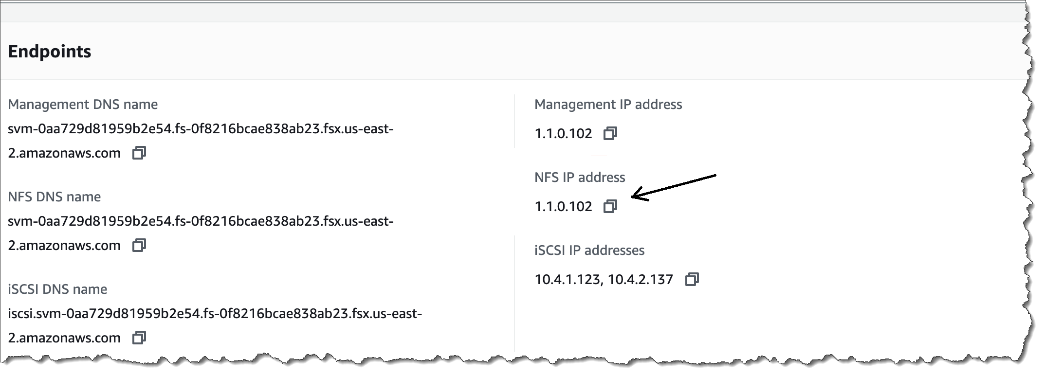 After the file system is created, locate the NFS IP address under the Storage virtual machines tab. The NFS IP address is the floating IP that is used to manage access between file system nodes, and it is required for configuring VMware Transit Connect.