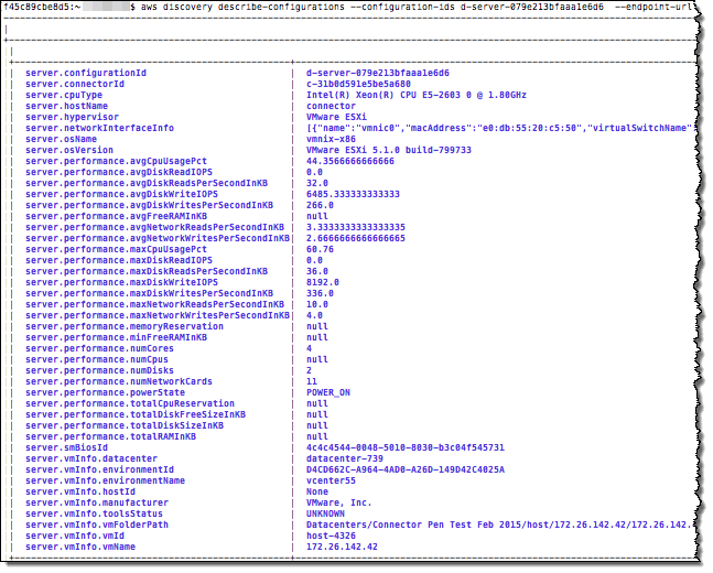 After the information has been uploaded, you can explore it using the AWS Command Line Interface (AWS CLI). For example, you can use the describe-configurations command to learn more about the configuration of a particular guest: