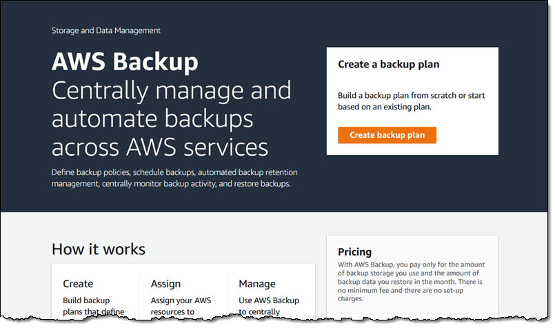 You can get started with AWS Backup in minutes. Open the AWS Backup Console and click Create backup plan: