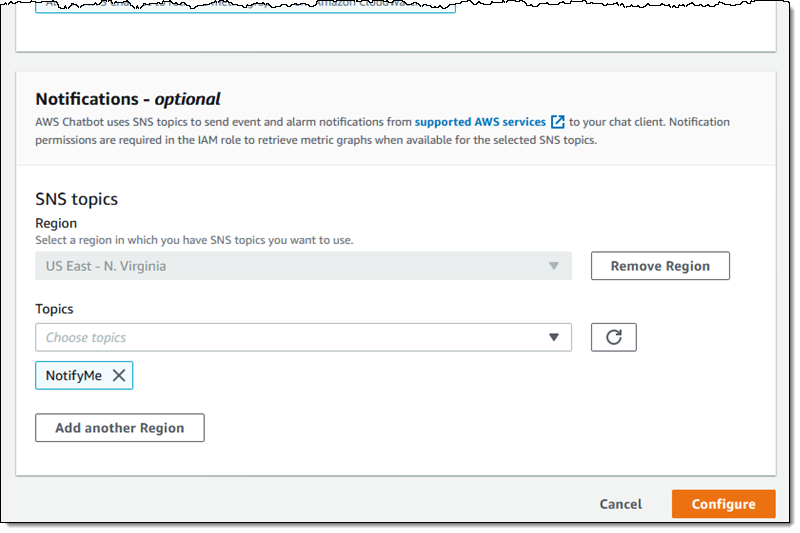 AWS Chatbot listens on Amazon Simple Notification Service (Amazon SNS) topics to learn about events and alarm notifications in each region of interest: